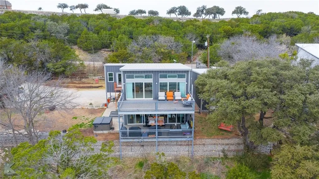 WATERFRONT HOME WITH EFFICIENCY APARTMENT! This stunning 2 bedroom 2 full bath multi level home with small efficiency apartment over garage has it all! Modern design with industrial touches add charm and character to this waterfront property on gorgeous Possum Kingdom Lake. Main and second level decks offer unobstructed views for sunrise morning coffee or peaceful lake nights. There is a wealth of natural light and breath taking views from primary bedroom, living room, and kitchen area. Primary bedroom has coffee bar with LG tower washer dryer combo. Second bedroom has Murphy bed with storage for hanging clothes. EXTRA BONUS is the 450 Sq. ft. multi level Efficiency apartment in garage. Private path to boat dock with custom made furniture for lake living at its best. Dock boast 2 slips with electric boat lift and hydro hoist, a jet ski dock and mooring whips to facilitate guest boats. Dock also has attached light for off the dock night fishing. Don't miss out on this piece of paradise! Enjoy the view and quiet slower paced side of PK Lake. CLICK ON VIRTUAL AND VIEW YOUTUBE DRONE VIDEO!