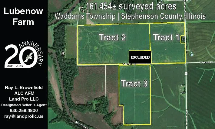 The Lubenow Farm is a highly productive 161.454 surveyed acre farm with 153.33 tillable acres in Sections 28, 29, & 32 of Waddams Township in Stephenson County, Illinois. Great location just 7.4 miles East of Lena, Illinois. There are no buildings, and the farm lease is open for 2024. This farm investment is being offered for sale in three tracts by the choice auction method.