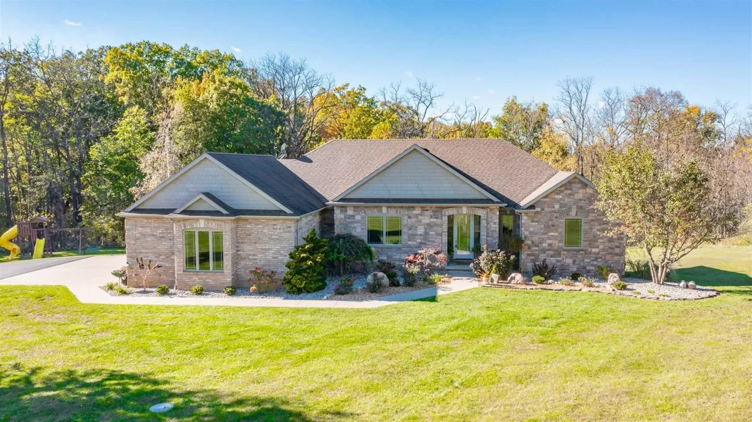 This stunning custom-built home is nestled on 5.8 acres and is truly one of a kind! Recently updated landscaping paves the path to the front door entry. When you walk into the home, youll be greeted by a large foyer with beautiful hardwood floors. The open floor plan gives way to the living room, complete with floor-to-ceiling windows, tray ceiling and a gas-log fireplace. The living room opens to the kitchen, which offers porcelain tile, solid wood cabinets, granite countertops, an eat-in island, gas cooktop, built-in oven & microwave and plenty of storage for all of your kitchen needs. Adjacent to the kitchen is a sunroom lined with windows that opens up to an uncovered deck overlooking the yard and rolling, wooded land. The main level also features a private master en suite, with a large bathroom and an oversized walk-in closet. Also on the main level is a guest suite, full bathroom and sizable mud room. The basement features a theatre room with a 140 projection screen and provides access to the outdoor entertainment area, which is complete with a stone fireplace and pergola! The basement also offers two bedrooms, two bonus rooms, a full bathroom, and ample storage. The 36 x 48 pole barn is insulated and offers a wood burning stove.