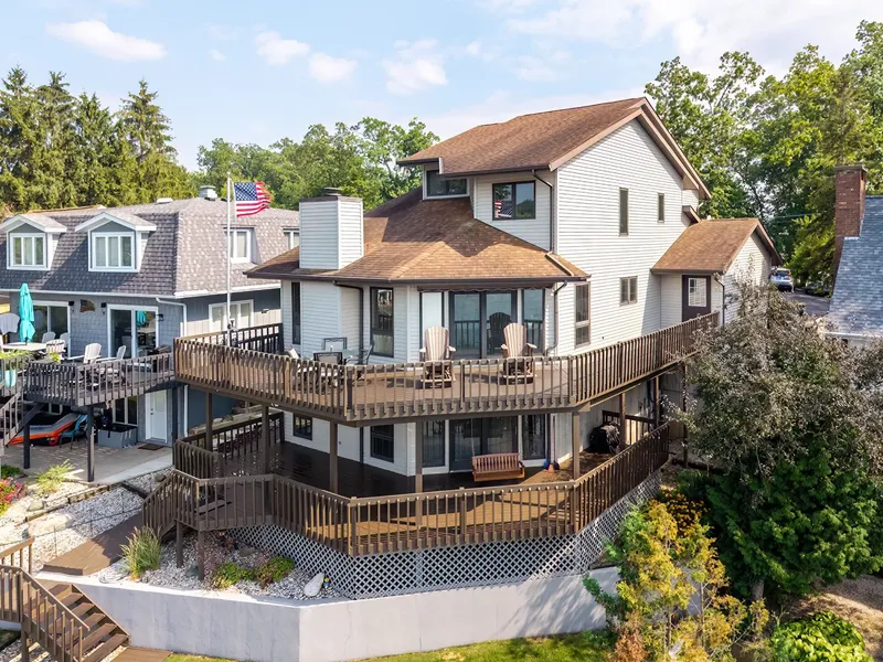 Wake up to paradise every single day at this delightful lakefront getaway on Lake James! Picture yourself sipping morning coffee while enjoying lake views from your front-row seat to nature's daily masterpiece. This cozy home delivers unspoiled lakeside delight with 50 feet of private lakefront with a sandy bottom on first basin. Step through the gorgeous entryway and stained-glass door into an open-concept layout with soaring vaulted ceilings that'll make you feel like you're living in a lakeside cathedral. This well-built 1990 home spans 2,358 square feet across 3 bedrooms and 2.5 bathrooms, perfectly designed for comfortable lake living. The living room's wall of windows frames the amazing sunset views perfectly, while the cozy gas fireplace keeps things toasty during cooler evenings. The kitchen's large peninsula bar is ideal for morning pancakes or evening snacks with friends and family. Upstairs, three comfortable bedrooms await, including a primary suite with water views, spacious walk-in closet, and private bathroom with walk-in shower. The walkout basement is 3/4 finished and ready for your personal touch—imagine a family room, game room or cozy retreat space! There is a plumbed half bath and electrical at counter height for a wet bar. But here's where the magic really happens: outside on your covered lower deck and open upper deck, you'll have front-row seats for the annual 4th of July fireworks show and the exciting Seaplane Splash-in events. The firm sandy beach is perfect for swimming, while your waterside shed and pump system make watering flowers and lawn and storing water toys effortless. Plus, you'll love the convenience of the two-car attached garage—complete with an additional third bay, perfect for storage or your dream workshop. Unleash your dream lake escape with endless summer memories, spectacular sunsets, and the ultimate lake lifestyle awaits!