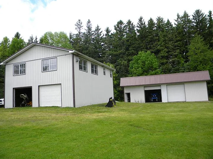The buildings include a 2 story, 30 x 40 metal clad pole barn with storage/workshop on the first floor, and living quarters on the second floor. The 1200 sq. ft. of quality living area includes a living room with large windows for natural light, eat-in kitchen with island bar, 3 bedrooms and full bathroom. The heating system is propane, and there is an engineered septic system with 1000 gallon concrete tank and leach field. There is also a 28 x 48 metal clad pole barn with half concrete floor for equipment storage and electric service. The property has a gated entrance and is off-the-grid, but there are electric circuit breaker p...