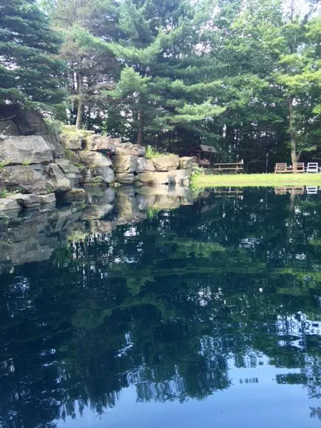 The land includes 5 acres which is heavily wooded to enjoy hunting and hiking on your own land. There is also a beautiful pond landscaped with huge boulders, waterfalls, and there is fish in the pond including trout.