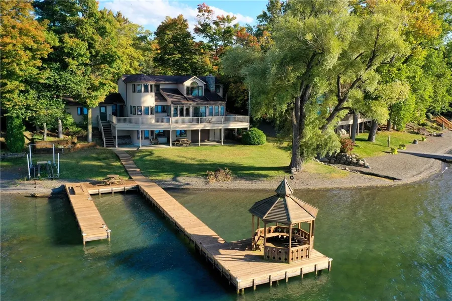 Keuka Lake-Contemporary year-round home, right on the water!! 3000 sq. ft. including the walk-out and partially finished lower level. The main house has 3 bedrooms with a possible 4th. 3 1/2 baths, two kitchens, central AC, wood-burning fireplace (easily converted to nat'l gas) in the spacious living room w/ vaulted ceilings. Two car garage, and then there is the "lighthouse/garage" with so much room for all of your collectibles, boats, cars, etc. This year-round space is filled with secret passages into entire rooms. A completely finished area on the second floor, which is totally independent living space, and then there is a real functioning lighthouse. Imagine the kids and/or grand-kids fun times exploring this unique space. The 122' wide beach is glorious with an all-natural frontage, and your own permanent dock. The neighborhood is one of a kind on Keuka, and the 1+ acre grounds make for an unrivaled Keuka experience. Please examine the "virtual tour" online. A public open house to be held on Saturday the 14th from 1-4PM. All offers can be responded to within 48 hours.