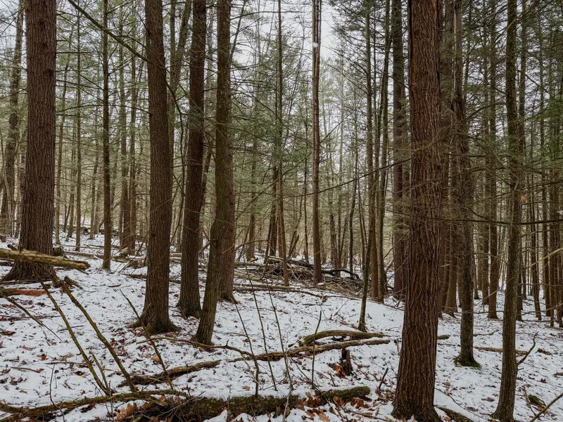 With road frontage on West Road, providing electric and internet capabilities, this property provides convenient access while still offering privacy. The land features a mix of red pine and open hardwoods, primarily maple and oaks, creating a beautiful natural setting. A gas line easement runs through the property creating an opening down the middle for viewing and ease of accessing the upper edge of the property.