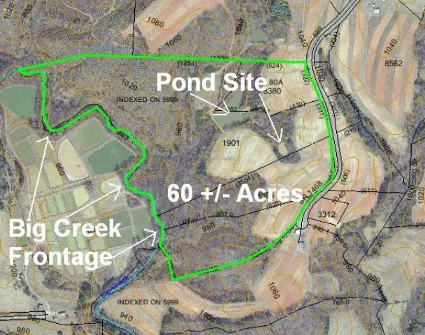 60 +/- acres Stokes County Westfield NC, Land, and Acreage For Sale. with approx 14 acre of open land, approx 1,450 ft of rd frontage, and approx 2,700 ft of Big Creek frontage. Has a nice building site overlooking a potential 2-3 acre pond site. Hunt deer and turkey in the back yard and fish in your side yard with this one. Property is located on a quiet dead end rd and is restricted to modular or stick built homes. Close to Pilot Mtn, Mt. Airy, Hanging Rock State Park and only forty minutes to Winston Salem. Additional land is available, Owner will consider Financing. PRICED REDUCED TO SELL AT $210,000