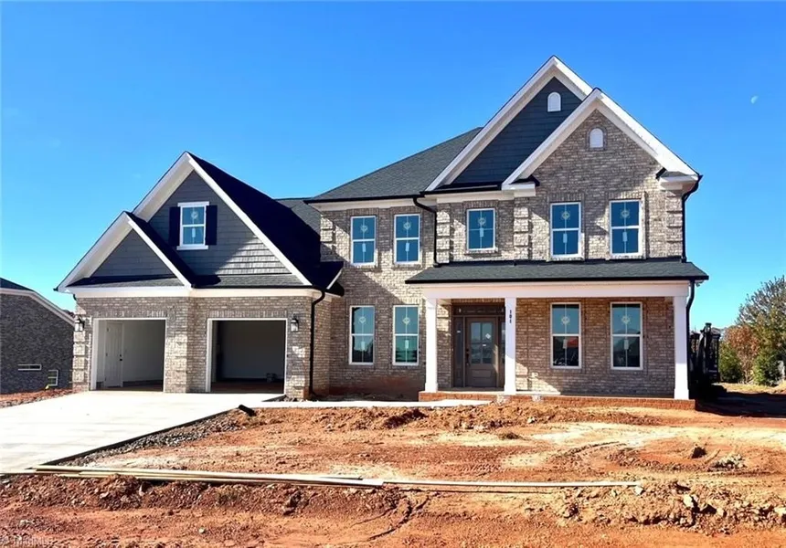 Under Construction - Gentry Farm lot #42! All brick home in King built by Arden Homes. The Roller Mill plan has an awesome open floor plan that offers over 2,200 sqft on the main level with 2 bedrooms and 2 full baths Exterior brick in "French Manor" with dark gray, black, and white vinyl accents, and stained wood front door with double sidelights. The large 2-story great room with gas fireplace adjoins back patio. Bright kitchen features island, with white painted upper cabinets, and stained lower cabinets in "Shale Gray" with Cosmo Carrara quartz counters, black hardware, gray picket tile backsplash, and Frigidaire Gallery Series stainless appliances. Upgrades on this home include a coffered ceiling and wainscoting in dining room, laundry sink with cabinets, dry bar/butlers pantry, and drop zone. Engineered wood floors in "Sawgrass Oak" thru most of the main level including the primary bedroom and closet, with black door hardware. {ROLLER MILL PLAN - Elevation B}