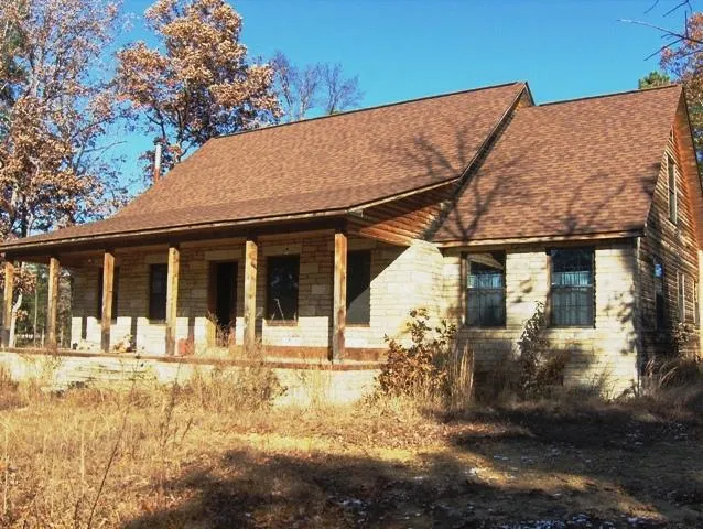 No. 01388 LODGE STYLE COUNTRY HOME for sale in the Ozark Mountains. Just a short drive from Mountain View with its folk music, one of a kind shops, and friendly atmosphere. This home is nestled in the trees on 3.36 acres with county road frontage, city water, central heat and air, power, phone with DSL available. What was once a young couples dream can now be yours. Their adventures have taken them to another state with no time left to finish the construction of this wonderful cut stone and wood home. Granite counters, all wood doors, hardwood throughout with ceramic tile in the 3 bathrooms. Drop in smooth cook top with built in oven, dining area flanked by bay windows and French doors, two story ceilings in the great room, 3 bedrooms downstairs, 1 bedroom with separate office, bath and a balcony area upstairs for a total of 2300 square feet. Knotty pine ceilings and walls, 6 inch walls, faux tile porches, attached post and beam carport, hearth for wood stove, and much more. Almost all the material needed to finish this home is included. All the major construction has been completed and the home is just waiting for some helping hands to do the finish work. Do not let the grown up landscape fool you, this one can be a real beauty. So for all you handy people, bring your tools and increase your equity in this home priced to sell at $208,000