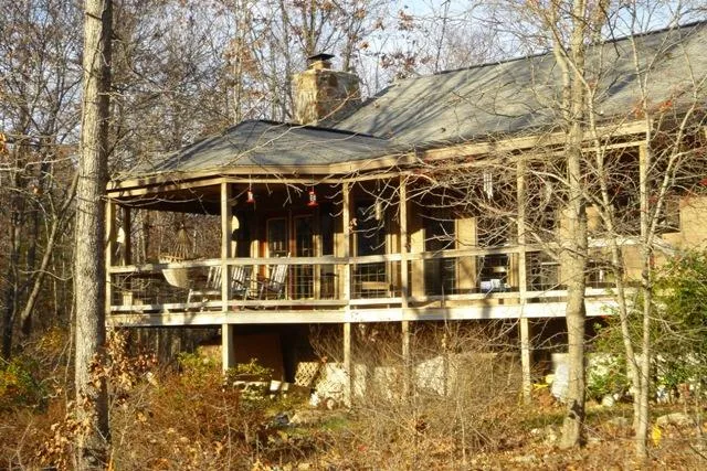 This custom home is nestled in the trees giving you wooded privacy. The beautiful great room fills with sunlight from the oak floors to the vaulted pine ceiling. A native stone hearth and chimney frames one end of the great room with a delightful kitchen at the other end. A cozy library/bedroom opens off the great room. The main level master suite has a private entry to the back deck. There is a wonderful claw-footed, soaking tub to ease your tired muscles. The cook of the family will enjoy the well set up kitchen with a movable island. Up the opened stair case is a large loft, bedroom and storage room. Enjoy the cool evening on one level of the 2 story screened porch. A versatile attached, 484 sq. ft., one bedroom apartment provides space for your parents or use it as a craft studio or home office. From the front dec...