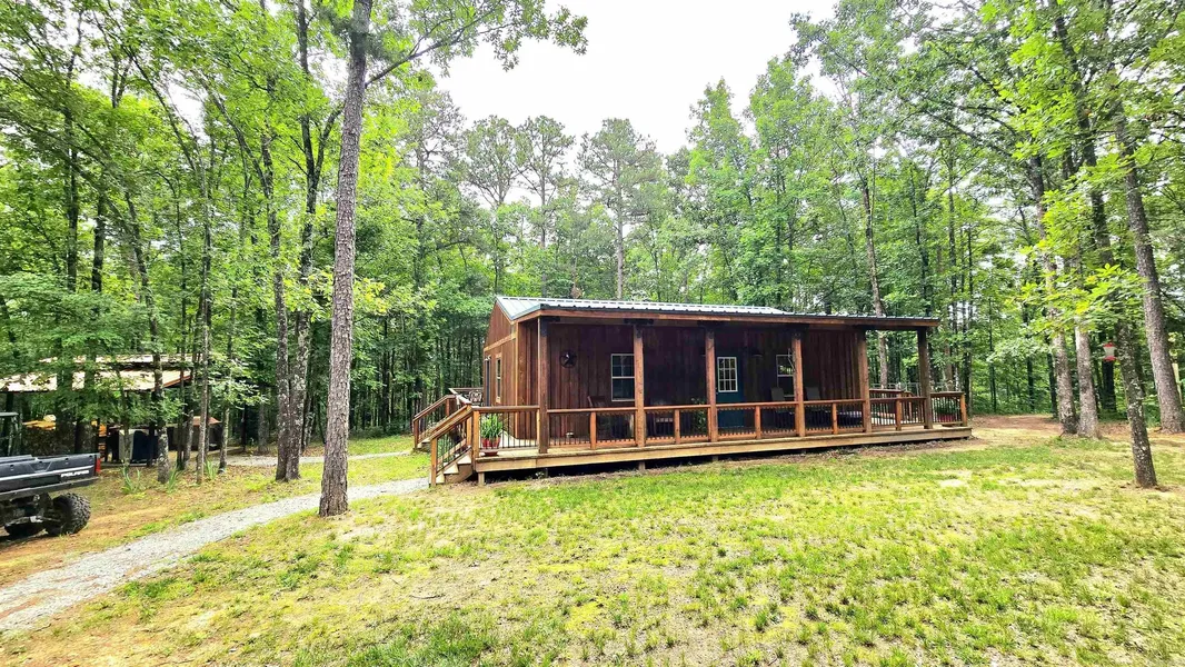 At a full price offer (just lowered price too) seller will consider paying some of the buyers closing costs! The main cabin is a 1 bed 1 bath with full kitchen, living area and wrap around deck, the 2nd cabin is another full cabin with 1 bed & 1 bath with living space and kitchenette, antique nails hold down the real wood pecan flooring, hickory cabinets hosts your dinnerware, tongue & grove cedar walls finish' off the interior walls while blue pine accents the ceilings all just a few custom details that makes this cabin a custom Ozark mtn home!! There are 2 containers with a carport sitting above to keep all your out door tools dry, 12x12ft tall door allowing you to driving into your shop with concrete floors with enough electricity to run 1 to 3 phase power! Inside you find your personal office feed by fiber internet, back that the main Cabin. The wrap around deck leads down to a custom BBQ & smoke station with LED lights that shine the way, hurry down to the slot canyon where the creeks that borders it is approx. 1/4 mile it offers multiple water flows, slides and areas to swim equaling approx. 1/2 mile of creek on this property. Rarely hunted land too!!