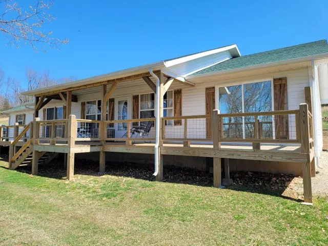 Amazing secluded home perched atop one of the most beautiful spots in the Ozark Mountains. Pull up to the gate leading to the long winding drive and you'll immediately feel right at home. As you wind up the hill and through the trees you'll notice amazing view start to come into focus. Walk to the front of the home and you'll fall in love with the huge covered porch complete with sliding glass doors leading from two of the bedrooms. Step in the front door to see a huge open room with vaulted ceilings that houses the kitchen, dining and living rooms all with beautiful hardwood floors. The kitchen features a fantastic subway tile backsplash, butcher block counter tops and a great bar area. The living/dining area has a very beautiful unique wood/coal cook stove that will heat the house nicely and you're still good to cook even if you loose power. The second and third bedroom are spacious an...