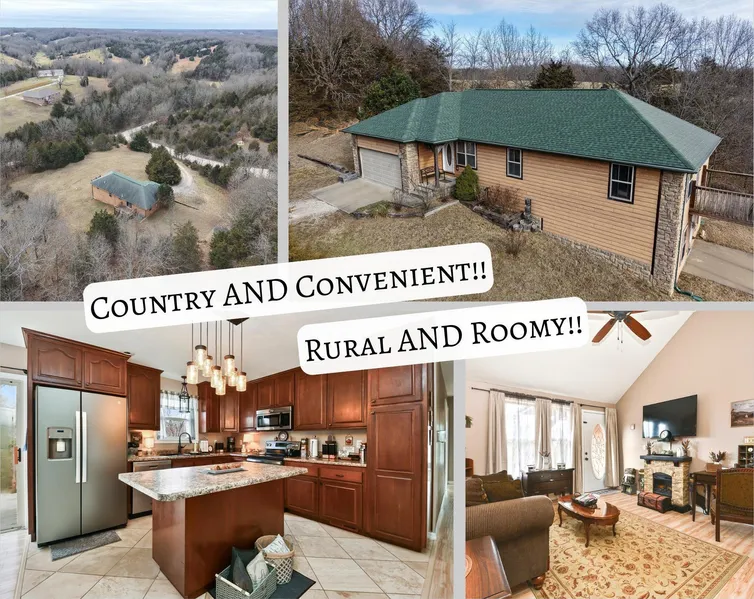 Convenient and Complete for Country Life! Just 1.5 miles from the highway, nestled privately on almost 3 acres, updated and roomy, this home is ready to welcome you. Enter into the combined living room, kitchen, and dining area that boasts a large kitchen island, custom cabinetry, and updated flooring -- and it will also include the electric fireplace, flat-screen tv, and wall mount in the living room. Use the master suite with tray ceiling, jetted tub, double sinks, custom cabinetry, and private deck as a calming retreat. Two other bedrooms on the main floor and two more true bedrooms in the basement provide plenty of space for a large family or crafts or an office or a man cave or whatever you need! The HUGE finished walk-out basement with kitchenette and included electric fireplace can become a second living area, playroom, fitness area, or maybe even a roller rink. It's big enough for whatever you can imagine!New hot water heater 2023, new HVAC 2025. Front portion of roof replaced 2024, new garage door 2024 with new-in-box garage opener to be installed. New dishwasher in box to be installed - it will match the rest of the appliances but is not shown in the photos. Step outside to the beautiful rolling hills and enjoy the peace of the Ozarks on the back deck. 35 minutes to Springfield, 30 minutes to Branson, 15 minutes to Branson West Walmart. It's the best of all worlds! This perfect combination does not become available often!