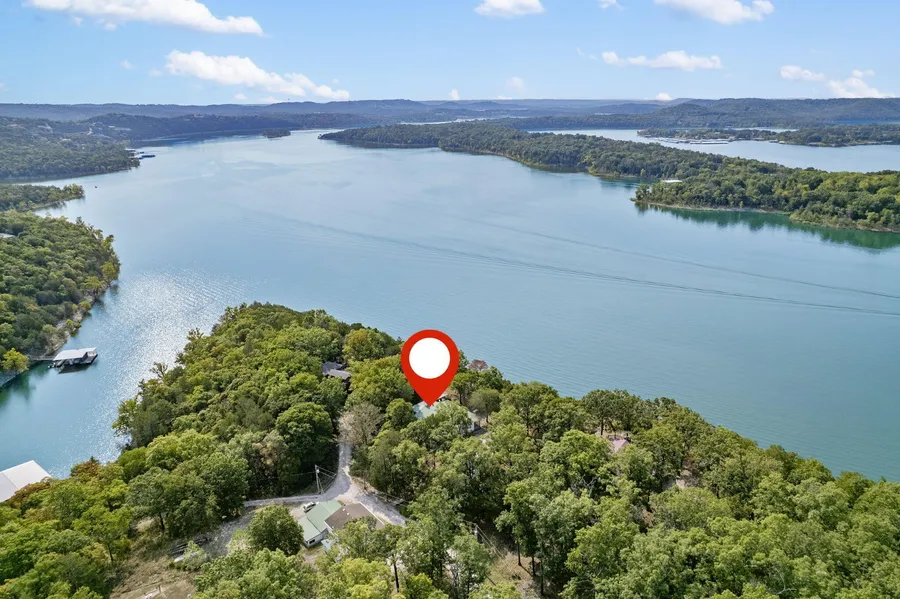 Panoramic Sunrise, Sunset, Lake & Mountain Views on Table Rock Lake! Welcome to your private lakefront retreat! Nestled on one acre of pristine Table Rock Lake frontage, this extraordinary property offers both walk-to-the-water access on one side and bluff-front vistas on the other--providing breathtaking views from every angle. Designed for entertaining and relaxation, the home features a partially covered, wrap-around deck, a bluff-front firepit, and scenic rock ledges perfect for enjoying unforgettable sunsets. Inside, the open-concept living area flows seamlessly into the dining and kitchen spaces, centered around a cozy stone gas fireplace and an enclosed sunroom for year-round outdoor enjoyment. The kitchen features beautiful Corian countertops, a stylish slate backsplash, new stainless steel appliances, and a pantry. The main-level primary suite offers stunning lake views, and an ensuite bath. The fully remodeled lower level (2021) includes an expansive family room with a second stone gas fireplace, two guest bedrooms, two full guest baths, and a laundry/mudroom. Recent updates also include a new water heater, whole home water filtration system, water softener, upgraded attic insulation, gutters and gutter covers, and fresh paint. Other features include a HVAC system with EcoNet Smart Home controls, vinyl siding, and a low-maintenance metal roof. Step outside to discover a stone walkway and bridge leading to a detached shop/garage with two garage stalls, additional carports, John Deere room, bunk room, half bath, and reloading room, a rare and unique amenity! Enjoy easy access to the lake via a private easement path leading to the dock, where two 10x24 boat slips are available for additional purchase ($$), one with a new lift. Boat slips are privately owned and must be purchased with the home. Furniture package available for additional $$. Private and peaceful--only four homes in the subdivision!