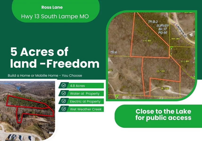 This serene and private location of almost 5 acres, with utilities at the road like Public Water & Electricity, allows you to begin to build your dream even faster. It has a natural spring on the lower end of the acreage! SO COOL!! This property is on a dirt road (Ross Rd) and has a flat area to build and then slopes down to the wet weather creek. So close to the lake... this property is only 5 miles from the public access points like Baxter Marina or the Port of Kimberling City! Enjoy the outdoors with the rolling hills of the woods and the natural spring that is on the lower part of the property. Beautiful!! With little to no restrictions, bring your ideas to life!