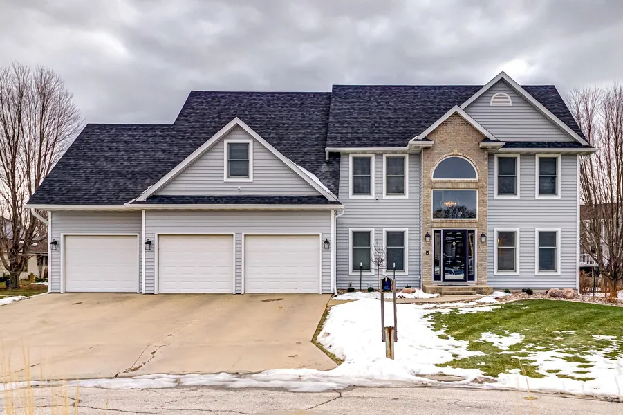 Tucked at the end of a cul-de-sac in Ames' highly sought after Northridge neighborhood, this two-story home offers over 4,100 finished square feet designed for comfortable everyday living. A tall, welcoming foyer with a statement staircase sets the tone upon entry. The main level features a dedicated office, formal dining room, a sitting room that serves as a second living space, and a kitchen with an informal dining area that opens to the main living room. The living room is anchored by a redone floor-to-ceiling stone gas fireplace with built ins, and a convenient half bath completes the main level. Upstairs, all five bedrooms are thoughtfully located on one level, including a spacious primary suite with vaulted ceilings. The primary ensuite offers a soaker tub, tiled shower, private water closet, and a large walk in closet. The upstairs laundry room adds everyday convenience without the need to move between floors. The finished daylight basement provides additional living room space, a bedroom currently used as a large home gym, along with a full bath. Recent cosmetic updates include refreshed bathrooms, new flooring, newer paint, and a new deck. A spacious yard and an oversized 3+ car garage with extra storage round out the home. With its size, layout, updates, and prime Northridge location, this home offers space, functionality, and long term livability in one of Ames' most desirable neighborhoods.