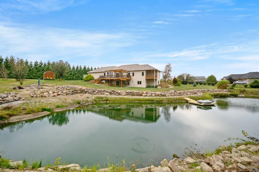 Welcome to a rare in-town acreage with your very own private pond and situated on a quiet cul-de-sac in Huxley, Iowa! This custom built, extremely well-maintained 4-bedroom, 3-bathroom ranch-style home offers over 3,100 square feet of finished living space, thoughtfully designed for comfort and versatility. The main floor features spacious living areas, a well-designed kitchen with ample cabinetry and counter space, and cozy dining and living rooms perfect for gathering, not to mention the heated primary bath floor. A second full kitchen on the lower level adds tremendous value for multi-generational living, entertaining, or additional culinary pursuits. The attached 4-car garage provides generous storage, while the expansive 3-acre lot offers privacy and tranquility. Enjoy the scenic beauty of your own stocked pond, ideal for fishing or simply relaxing in your private backyard retreat. ...