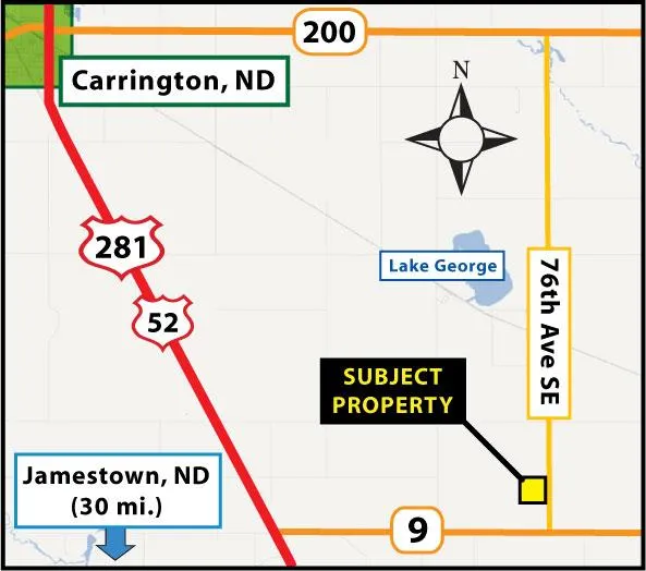 Research Parcel InformationDriving Directions: From the south edge of Carrington, ND travel 8 miles southeast on Hwy #281 to the Junction of Hwy #9, then 5 miles east to 76th Ave SE, then mile north to the southeast corner of the property.