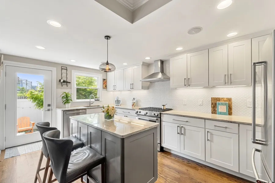 This sunny, 4+ bedroom, 3.5 bathroom, 2,235 square foot, single family home is located on a quaint gas-lit street near town center and features an open layout and recent renovation. A spacious living room, with tall ceilings, plantation shutters, and gas fireplace flows to an elegant dining area - perfect for entertaining. The chef’s kitchen features Thomasville cabinetry, granite countertops, tiled backsplash, stainless appliances, center island with storage, and direct access to a private fenced-in patio with garden area and peach tree. The finished basement below serves as a media room, gym, and playroom. The beautiful, second level, primary bedroom offers an oversized, custom walk-in closet and full bath with marble topped double vanity, and marble tiled shower with dual showerheads. An additional bedroom completes this level, currently used as a home office. There are two bedrooms upstairs, each with an en suite full bath; plus a laundry center. A stunning private roof deck with spectacular, unobstructed city views completes this offering.