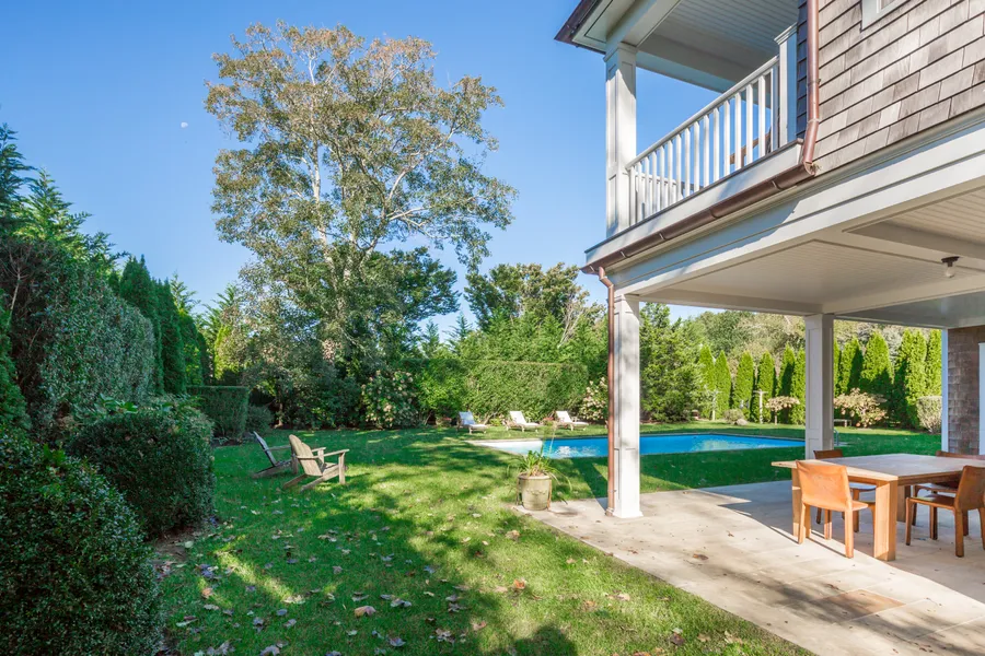 Sitting proudly on a private .71 of an acre of park like grounds is this beautifully rebuilt and expanded traditional home filled with sophistication, style and grace. This home boasts an elegant master suite with wood burning fireplace and a sitting area that opens to its own private balcony overlooking the heated saltwater pool and lush grounds. There are 3 guest bedrooms, 2 with their own outdoor sitting areas, and 2 additional, beautifully appointed marble baths. Prepare to be pampered in style and comfort by the spacious open living room featuring numerous sets of French doors, a wood burning fireplace and highly crafted finishes. The chef's kitchen and open dining area are equally perfect for entertaining large groups or an intimate dinner for two. And, of course, this space opens to a large covered patio for enjoying summer meals. A finished lower level provides a den, recreational space and storage. Approached by a gated private drive off a quiet lane just outside East Hampton Village, this home provides the best of both worlds... village edge location and a tranquil setting surrounded by English style gardens and privet hedges. A truly exceptional property in a prime location.