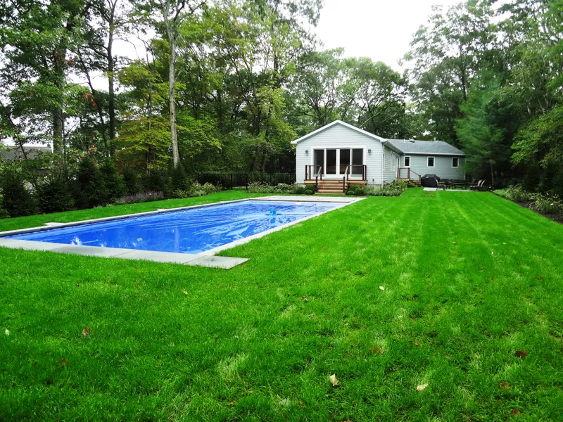 Beautifully decorated and exquisite finishes is this 4 bedroom 3 1/2 bath ranch home with Big Fresh Pond views. Home offers an open concept living, dining, kitchen layout all overlooking the serene pond. There are 3 guest rooms, one has an en-suite bathroom. The master bedroom is privately located in the rear of the home overlooking the brand new Tortorella built heated, gunite, salt water pool. The property comes with direct access and a dock for all non-motorized water fun.