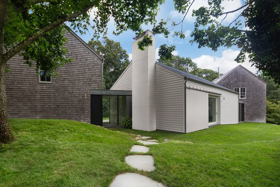 An inspired rendition of a modernist barn-style aesthetic, this well-known architecturally significant home was completed in 2012 by the current owners and embodies the elegant simplicity of country life at the beach. Architecturally unique, two barn-style structures clad in Alaskan silver cedar and a more modern structure are connected by glass and steel walkways all bathed in natural light with floor-to-ceiling windows. One wing serves as a guest house with four bedrooms and two baths while the other wing offers a private master suite with two offices. The modern center structure with a zinc roof, polished concrete floors, vaulted beamed ceiling and massive sliding pocket windows is the communal gathering place featuring a great room, dining and kitchen area that all open up and connect to the outdoor spaces. A separate media room and den connects to the walkway to the pool house. Throughout, wood floors are painted the soft grey of a Finnish farmhouse, a homage to the owner's roots. Modern fixtures and lighting play off the textural interest of brush painted wood paneled walls throughout. The home is meticulously built and engineered with radiant floor heat throughout, geothermal cooling, an aggregate finished chlorine free pool and a significant whole house water purification system. Surrounded largely by working farms in the Amagansett Stony Hill estate section the setting is peaceful and serene. A pool with sunshade and a pool house, bluestone terraces for dining and lounging, expansive grounds and a two-car garage are enveloped in a shy four acres of lush landscape for complete privacy. Enjoy the bounty of nearby organic farm stands, ocean and bay beaches and charming Amagansett village.