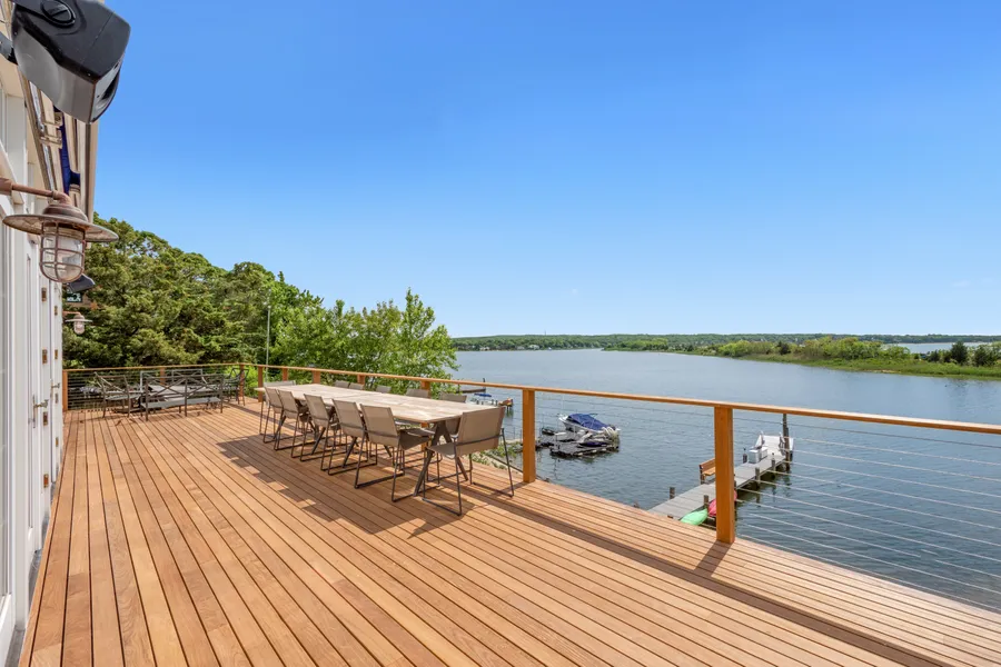 This sylish, renovated Bayfront offers the most fantastic waterfront experience, with Dock, Gunite Pool and expansive waterfront decking. The 4,500+/- sq. ft. home is spacious with an open flow, facing West over the bay for stunning afternoon sun and sunsets. A two-story living room, kitchen and dining room offer walls of windows that drench the home with light and views. This is the perfect family house with 5 bedrooms, (plus a room with a sofabed), 5 1/2 baths, and a finished lower level (with pool bath) that opens to the pool. Enormous mahogany decks with cable rails allow for easy outdoor living and entertaining just above the water. The house is across from Long Beach, and 2 minutes to Sag Harbor Village. Also available Two Weeks in August $50K