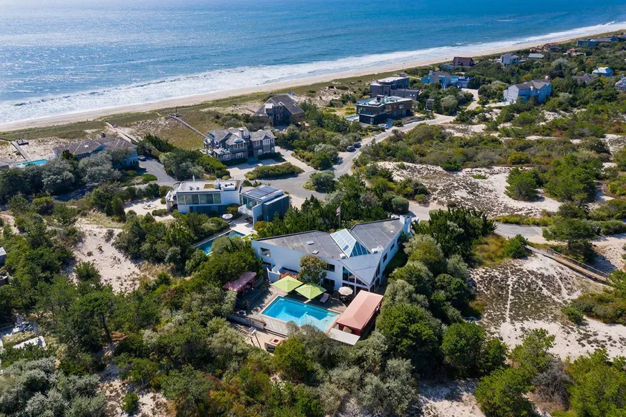 Rarely does a turn-key property with the size, scale, breath and condition come up for sale in coveted Amagansett Dunes. With deeded beach access, located less than 300 feet from the powdery sand of the Atlantic, this striking Hollenbeck contemporary is set on a dune to maximize ocean views. This 6,000+ sq. ft. contemporary home with walls of glass throughout features 8 bedrooms, 5 full and 2 half baths sited on over an acre of prime real estate. The 2- story upside down home with an opportunity to finish the full basement, offers a spacious open great room with living and dining area, a lovely gourmet kitchen with 2 ovens and 2 dishwashers, a custom den/office and two additional living/seating areas on the first floor. The bathrooms feature Ann Sachs tile and stone. The top floor features an expansive mahogany deck overlooking the ocean with constant breezes. The pool area, reminiscent of a resort, features a 40'x20' heated, salt water, gunite pool wrapped by extensive Mahogany decking, a full outdoor kitchen with granite trimming, several beautiful entertaining pergolas and a custom stone fire pit. Other unique amenities include a 2-car garage, parking for up to 6 additional vehicles, generator and a full unfinished basement. This large property is in a prime location, abutting a 16+ acre reserve that offers complete privacy. Sited on a FEMA X zone, and one of the largest non-oceanfront properties in the Dunes, this unique offering is beyond exceptional.