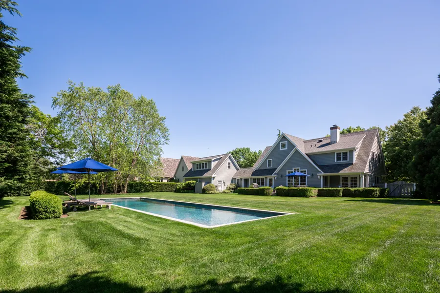 Beautiful landscaping that leads to open foyer onto double-height living room with fireplace looks onto 60 foot heated gunite pool. Open and bright living with country kitchen. Study/office on first floor behind master bookcase. Also great guest suite over the garage. Conveniently located in East Hampton Village and Main beach with added bonus; rental includes Main beach Locker. Any two week period in 07/01/2021 - 08/31/2021 for $45k.