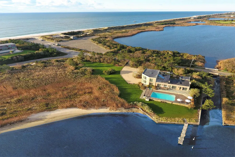 This perfect modern beach house on coveted Flying Point Road is available for the first time as a winter rental. With 360 degree water views it's light makes this house, one of a kind. The sun rises on Mecox Bay and sets on Channel Pond, and the house overlooks both as well as the Atlantic Ocean right across the street. There are a total of 5 bedrooms with both first floor and second floor primary bedrooms in addition to a sitting room, TV room, living room and open kitchen/dining room. Especially important this year is walk-out lower level gym with a Peleton, elliptical machine, treadmill as well as weights. There are 3 different outdoor decks on various levels and they face different locations for view/sun optimization. There is even an outdoor fireplace and hot tub. Very bright and furnished in easy haute beach style makes 1030 Flying Point. Also available March for $25K; April for $25K.