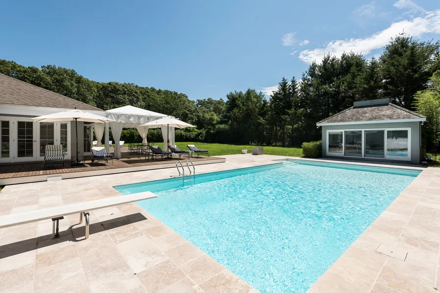 Post Modern house sits on one +/- acre of beautifully landscaped grounds with large pool, furnished pool house, gorgeous, rolling lawn and outdoor shaded dining area with barbecue grill. House architecture has a contemporary feel for airy, sunny rooms with lots of white color and modern shapes. It has a living room with brick fireplace, dining room/open kitchen, four bedrooms (one master suite and one junior master bedroom with brick fireplace), four fully renovated all marble bathrooms and central air-conditioning. It is situated minutes from Bridgehampton and just over one mile from the beach. Home is furnished luxuriously with all new Restoration Hardware furniture. Also available June for $55K; September for $40K; October for $35K.