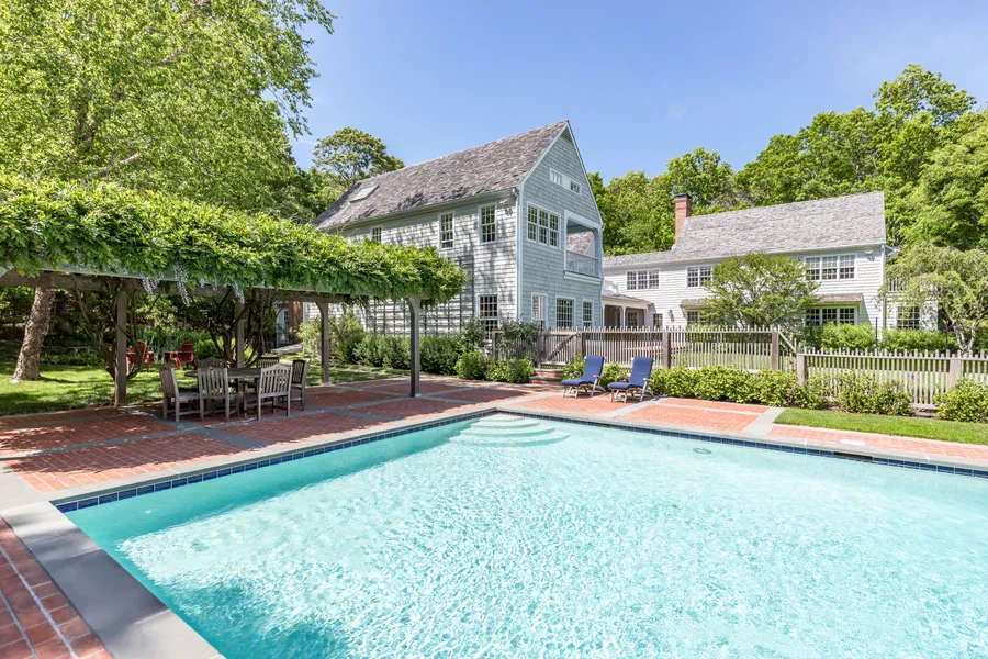 Set on 1.8 acres only minutes from the sandy ocean beaches of Amagansett, this Forst and Silverblank custom-built 6,830 +/- sq. ft. home offers seamless indoor-outdoor living through a series of French doors, and expansive southern views from its multiple porches, decks, and terraces. Upon entering the home, a large living room with a double height ceiling, fireplace, and skylights provides wonderful entertainment space. The spacious formal dining room overlooks a brick patio with a fountain, and the eat-in kitchen opens onto a covered porch. A cozy den with a fireplace, two bedrooms, sun-room, laundry room, and over-sized 3 car garage complete the first floor. The high ceiling primary bedroom suite on the second floor includes a charming covered porch, walk-in closet, loft space, and gracious bathroom with free standing tub, shower, double sinks, and storage. The second floor also features a junior bedroom suite with separate sitting room and outdoor deck, a media room, a separate TV area, an office, and a laundry room. A full-size squash court is located in the lower level. Outside, the 50'x22' heated gunite pool is anchored at one end by a large, wisteria covered pergola. Distant views of the South Fork Golf Club enhance the pastoral feeling of this secluded property on a quiet road in the prestigious Bell Estate. While Amagansett's shops and restaurants are nearby, this property exudes a sense of privacy and tranquility. An adjacent 1.5 acre vacant lot, with room for a significant home, pool, and pool house, is also available for sale upon the purchase of this idyllic Amagansett retreat.