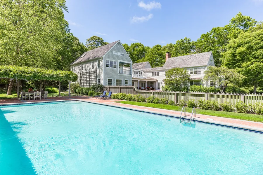 On a quiet road in the prestigious Bell Estate, a unique opportunity to create a compound on 2 single and separate lots: a 1.8 acre lot features a custom built, 6,830 +/- sq. ft. home adjacent to a 1.5 acre vacant lot with lush landscaping and room for a significant home, pool and pool house. This private sanctuary is close to the sandy ocean beaches, shops and restaurants of Amagansett. The Forst and Silverblank residence offers seamless indoor-outdoor living through a series of French doors, and expansive southern views from its multiple porches, decks and terraces. Upon entering the home, a large living room with a double height ceiling, fireplace, and skylights provides wonderful entertainment space. The spacious formal dining room overlooks a brick patio with a fountain, and the eat-in kitchen opens onto a covered porch. A cozy den with a fireplace, two bedrooms, sunroom, laundry room, and over-sized 3 car garage complete the first floor. The high ceiling primary bedroom suite on the second floor includes a charming covered porch, walk-in closet, loft space, and gracious bathroom with free standing tub, shower, double sinks, and storage. The second floor also features a junior bedroom suite with separate sitting room and outdoor deck, a media room, a separate TV area, an office, and a laundry room. A full-size squash court is located in the lower level. Outside, the 50'x22' heated gunite pool is anchored at one end by a large, wisteria covered pergola. Distant views of the South Fork Golf Club enhance the pastoral feeling of this secluded property.