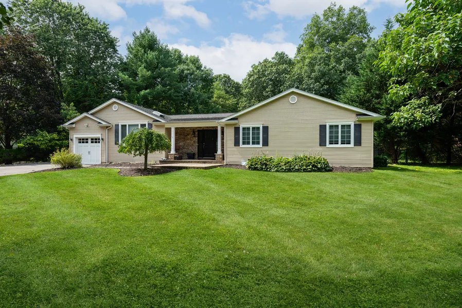 his is the Ranch you have been waiting for. Open, airy, bright. The welcoming porch and foyer opens to the living room with fireplace and vaulted ceiling. The dining room and updated kitchen are an entertainer's delight. The kitchen island has a second prep/bar sink with built-in wine fridge. Quality appliances and cabinets. The master bedroom has an updated bath, walk-in closet, and sliders to the pool. A first floor laundry and mud room are so practical. The finished lower level is the perfect rec room with wet bar, media wall, and door to yard and pool. A full bath and office/game room completes this fun space. The level acre of land makes your outdoor life all that more enjoyable.