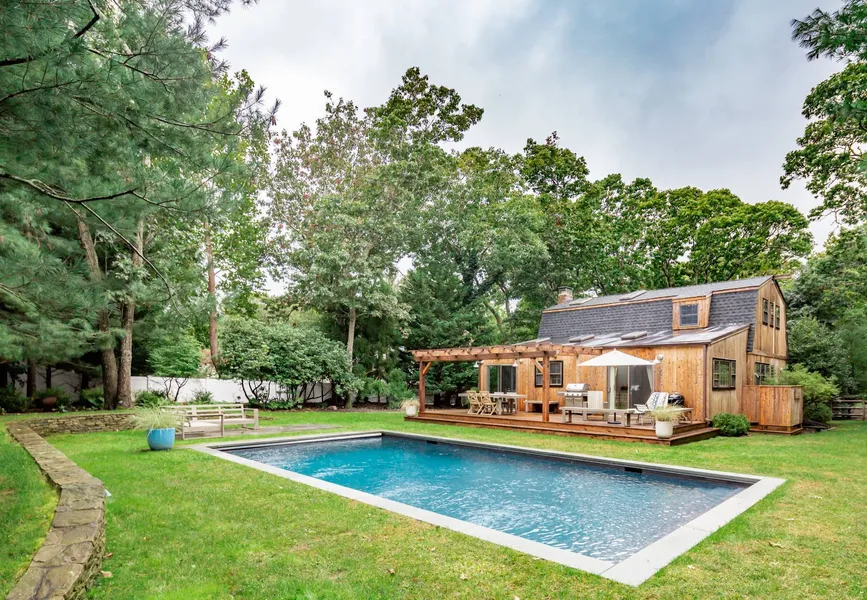 Grab your paddleboard and get ready to enjoy life in Clearwater Beach. New to the market, this home has many updates inside and out and is ready for immediate enjoyment. Exterior upgrades include a new heated gunite saltwater pool with motorized cover and bluestone surround, exterior sound system, stacked bluestone retaining wall with lighting, deck with pergola, outdoor shower, and great shed with skylights. Partial winter water views facing west, and just 3/10 mile distance to the beach and marina entrance, make this retreat ultra desirable. Inside the home you will find wide plank hardwood flooring, new chefs kitchen with stone counters and stainless appliances, new main floor primary bath, double height great room with wood burning fireplace and beamed ceiling, sunny media room with floor to ceiling windows, 4 bedrooms, 2 baths. Town water, and CAC. Annual Property Owner Association dues are $300. In addition to being one of the few lifeguarded Bay beaches in East Hampton each summer, Clearwater Beach offers Kayak storage and boat slips available for seasonal rental, plus a new Bocce court, playground, sandy beach, fishing, wi fi, and more.