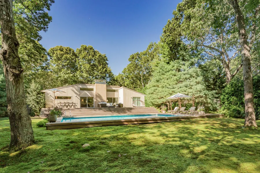 Featured in the New York Times for its renovation by the prior owners- principals at the Manhattan architecture and interiors firm responsible for Scarpetta in the meatpacking and Blanc de Chine on Fifth- this exceptionally maintained and voluminous modern beach house makes a big statement with a manageable footprint. Set on a secluded half acre lot immaculately carpeted by sumptuous moss and dotted with oaks and pines, the dining area and sitting area with fire pit rest on a broad mahogany deck overlooking the heated pool and rear grounds sheltered by mature landscaping. The home's H-shaped layout creates a bright great room at the center with a brick, wood-burning fireplace, sliding French doors opening to the rear deck, and clerestory windows for additional light. The open eat-in kitchen, done in a handsome gray accented with Gucci wallpaper, offers sleek and timeless stainless steel ...