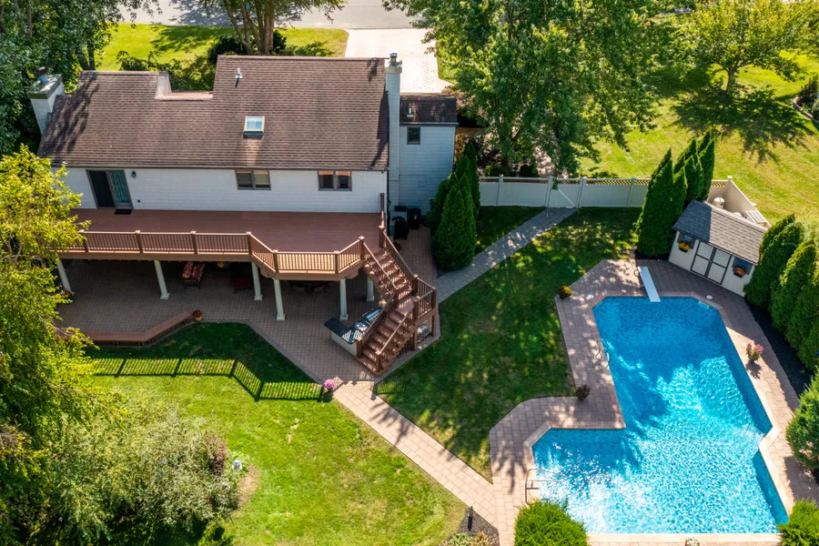 Truly a move-in ready home in The Manors at Baiting Hollow. The kitchen and master bath have been totally updated (2008 and 2015, respectively) and are true show stoppers! Bamboo flooring on 2nd floor and engineered hardwood flooring on the first, wood burning fireplace and built-ins in den, vaulted ceilings and spacious rooms. 18x40 offset L shaped in-ground pool with new liner (2021), waterfall and an elevated pool patio, paver patio and a second story deck, accessible from backyard and primary suite. Burner, roof, Andersen windows and siding have all been updated. Don't miss this one!!