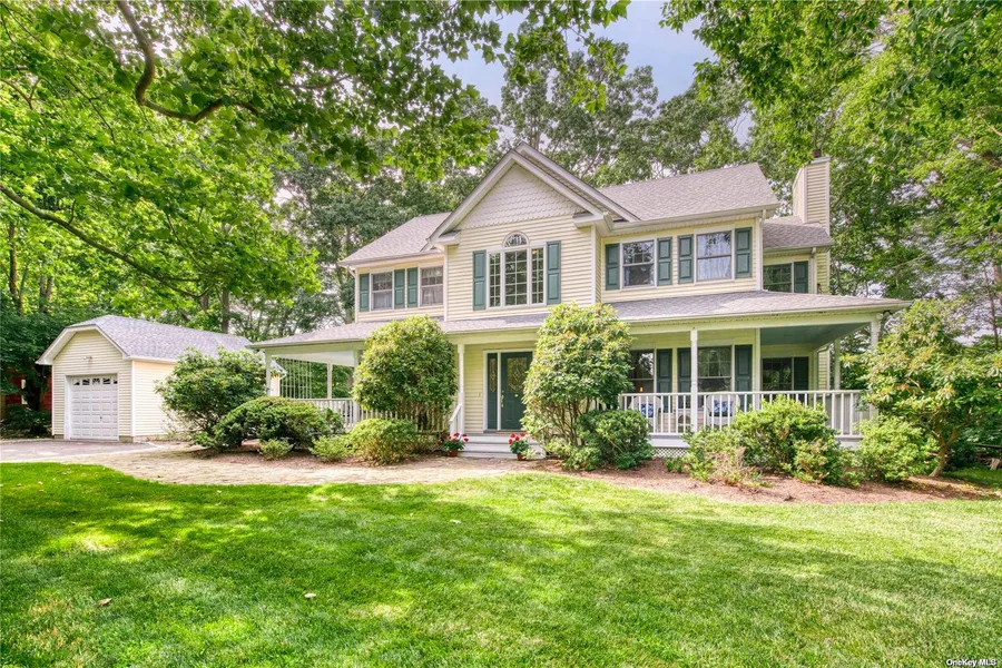 Located in the quiet neighborhood, Yennecott, behind a row of mature rhododendrons a spacious Waterfront Farmhouse with wrap-around porches. Custom designed & built on .75 acre with 260' of water frontage on Long Creek. Details abound, beautiful woodwork, arched entry ways, abundant windows adding beautiful light. Enjoy nature year round from the enclosed waterside porch. Great thought went into the design of the floor plan, balancing common and private spaces. Big views of the creek, a mooring for a small motor boat, ideal for fishing, sailing and tubing on Hashamomuck Pond plus beach rights as a member of the Southold Park District. Master suite plus three additional bedrooms, 2.5 bath total, living, dining, den, laundry, studio/office, White cabinets grace the granite/stainless kitchen with breakfast nook. Full basement, partially finished, updated mechanicals. A reputable Pool company believes an in ground pool can be installed behind the detached 1.5 car garage.