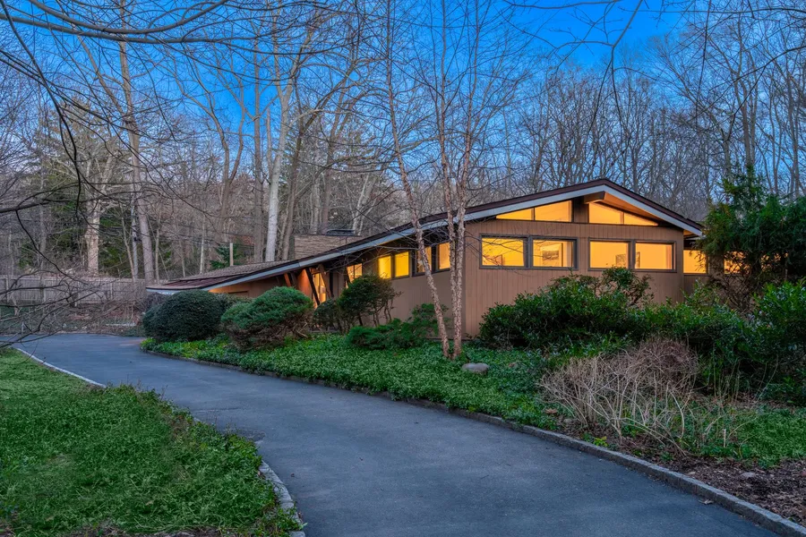 An aerospace engineer designed this mid-century modern house for himself and his family. He was influenced by the architectural movement of the time - using new and innovative materials and technologies to illustrate the idea that form should follow function and an embrace of minimalism. The design of the house, with the angled garage, and a sweeping overhang in front, is reminiscent of an airplane wing. The house is perfectly sited on 1.6 private beautifully wooded acres with an in-ground pool. The back of the house offers southern exposure with an overhang designed to provide passive solar heating in the winter months when the low sun reaches almost across the living space. During the summer months, the sun does not reach into the living space minimizing the cooling effort. A unique window wall made up of five 8' by 8" thermopane windows are canted out at a 7 degree angle so when sitti...