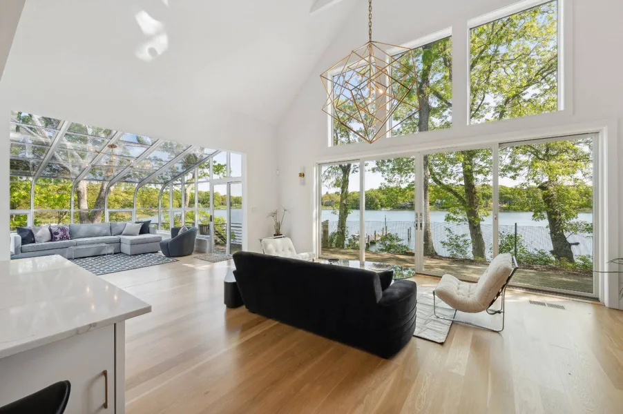 THIS TURNKEY HAS IT ALL Uniquely perched above a magical 1.30+/- acres this 3,000 sf+/- newly renovated waterfront contemporary sits on the revered and sheltered Menantic Creek. 300 feet of water frontage with a private deep-water dock with the capacity for 4 boats that allows for easy access to West Neck Harbor and the Peconic Bay beyond, all within close proximity to the coveted Island Boatyard, rightfully secures this home as a boater's paradise. Extensive decks, a Japanese style rock-terrace, abundant lush gardens, a newly built gunite pool surrounded by white marble, a hot-tub, outdoor shower and sauna are all easily accessible from the home, designed for ultimate indoor-outdoor living. The interior has soaring ceilings and is flooded by natural light from the bank of waterfront windows and sliding glass doors. The kitchen features quartz countertops and stainless steel appliances a...