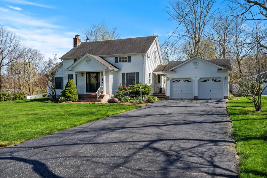 Positioned on a generous 0.6-acre lot, this 3 bed, 3 bath home features a welcoming foyer with ample closet space that leads into a beautifully structured interior. The large eat-in kitchen is equipped with a spacious island, double oven and granite countertops, ideal for preparing gourmet meals. The formal dining room, warmed by a wood-burning fireplace, provides a perfect setting for elegant dinners, while the formal living room offers a serene space for relaxation. The spacious den, accentuated by vaulted ceilings and a gas fireplace, is perfect for hosting gatherings. A laundry room and full bathroom complete the ground floor's offerings. Upstairs, the master bedroom serves as a private retreat with its en-suite bathroom featuring double sinks, alongside two walk-in closets. There are two additional bedrooms and full bathroom on the second floor. The property also includes a detached 2-car garage with a covered walkway connecting to the home, providing easy access in any weather. An outdoor shed offers additional storage. The home also includes a full, unfinished basement with high ceilings, bilco doors to the backyard, and a large cedar closet, offering extensive storage possibilities and room for expansion. The backyard is expansive and level, providing a fantastic canvas to design your ultimate outdoor sanctuary. With close proximity to the Hamptons, this home combines convenience with quiet suburban charm.