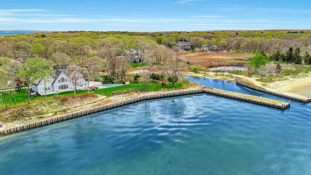 Southold, Paradise Point Bayfront. Private peninsula in Paradise Point Community. Water on 3 sides with sweeping, open views across Southold Bay to Shelter Island and beyond. This unique waterfront setting includes 994 feet of shoreline and a deep-water dock in a protected boat basin. Approach this 5,100 sq. ft. home from the circular drive. Beautiful plantings frame the entry. Step into the grand entry foyer of this 2 story, 4 bedroom, 3.5 bath Nantucket style residence, with views through the foyer and house onto the open bay. A dramatic and exquisite first impression. High ceilings, huge gracious rooms. An open first floor design, living room with wood burning fireplace. Expansive windows, glass doors and transoms allow flow to the large outside wrap around waterside porch. Incredible light, and extraordinary sunset views. Oak floors throughout. First floor sitting room with gas fireplace and an office/den alcove. Huge chef's kitchen, with stainless appliances and granite counters, overlooking the bay and pool. Space for casual dining in kitchen, and a formal dining room overlooking the boat basin. Laundry room, one bayside en-suite primary bedroom, and an additional half bath complete the first floor. Second floor primary en-suite bedroom and sitting room with magnificent views over the pool and open bay. 2 additional large bedrooms with water views sharing a full bath. The open second floor landing boasts sweeping water views. Elevator accessed by 3 floors, generator, spacious walkout basement waiting for your imagination with endless possibilities. Waterside heated pool and 2 car garage. 1.8 acres. Specimen plantings. Beautiful shoreline landscaping. If you are looking for an exceptional home and property, this is it.