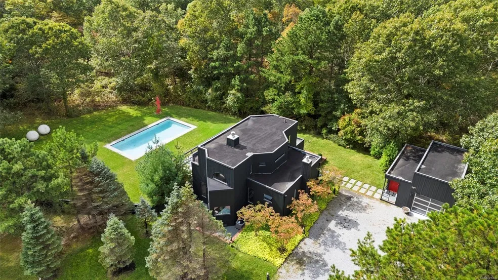 Welcome to this architecturally stunning contemporary home, where modern design meets functional living spaces. Upon entry, the clean lines and open layout create an immediate sense of flow, with large windows that bathe the home in natural light and provide stunning views of the surrounding landscape. The kitchen, designed with both style and practicality in mind, features sleek stainless steel appliances, ample counter space, and a thoughtful layout for ease of cooking and entertaining. Adjacent to the kitchen, the dining area overlooks the lush outdoors, seamlessly connecting indoor and outdoor living with access to the expansive deck and heated pool. The living spaces showcase a perfect balance of form and function. Unique design elements, including textured accent walls and stylish lighting, add to the home's distinct charm, while the open-concept layout creates ideal spaces for relaxation and entertainment. The cozy sitting areas and stylish modern fireplace provide warmth and ambiance. This home offers two bedrooms, including a convenient first-floor bedroom with easy access to the main living areas. Upstairs, the private primary suite serves as a peaceful retreat, featuring a bath complete with a sauna and jacuzzi, and two walk in cedar closets. Outdoors, the spacious deck is perfect for lounging or dining al fresco, with a heated pool ready for enjoying long summer days. The detached garage provides flexibility, whether you're looking for a home office, art studio, or extra storage space. The property is also zoned for up to four horses and has plenty of room for expansion, offering endless possibilities for customization. Situated in Flanders, NY, this home is an ideal retreat for those seeking privacy without sacrificing accessibility. Close proximity from Manhattan and minutes to Gabreski airport. Nestled between The Hamptons and the North Fork, this home offers the best of both worlds.