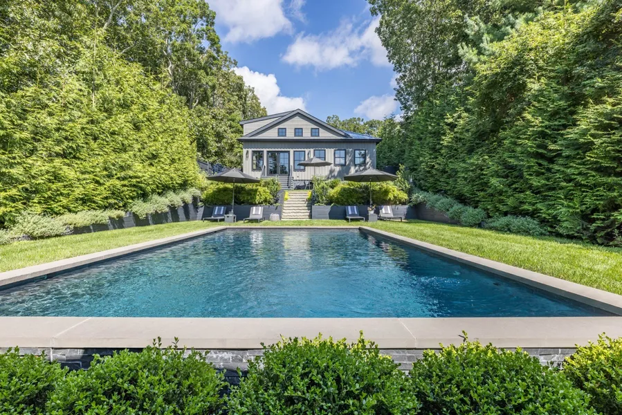 Perched on one of the highest points in Sag Harbor Village, on a generous third of an acre, with western exposure for lovely sunsets from the dining terrace, this designer owned and recently renovated 5-bedroom village gem features bright and voluminous interiors and inviting outdoor spaces complete with a heated, gunite pool and pool house. The property has several amenities quite uncommon for Sag Harbor Village including a detached 2-car garage, two areas of off-street parking in the front and rear, and a walkout, finished lower level with exceptionally high ceilings. Through the foyer, the great room with soaring 16' ceilings and abundant fenestration features a gas fireplace. The open, gourmet kitchen and dining area profit from elevated views of the rear grounds with a set of French doors to access the terraced outdoor entertaining spaces. Ensconced by walls of greenery and lush landscaping for total privacy, the 36x16-foot heated, gunite pool is complemented by a cabana style pool house with refrigerator and ice maker, an al fresco dining terrace, and outdoor shower. The main level offers three well appointed en suite bedrooms including the primary bedroom suite with a luxurious soaking tub and rainfall shower. An office, mudroom, and powder bath complete the main level. Upstairs, the second primary suite receives lovely light and has a stunning bath with Italian porcelain, rainfall shower, and a dual vanity. Capitalizing on the natural grade of the property, the walkout, finished lower level offers an expansive recreation room with ample space for a sitting area and table tennis, gym, wine room, powder bath, laundry room with dual appliances, and the guest bedroom suite. A unique opportunity to own a beautifully renovated, designer gem in Sag Harbor Village with the privacy afforded by mature landscaping and the convenience to leave a vehicle at home for trips to Harbor Market, Il Cappuccino, or to explore the charms of Main Street and Bay Street.