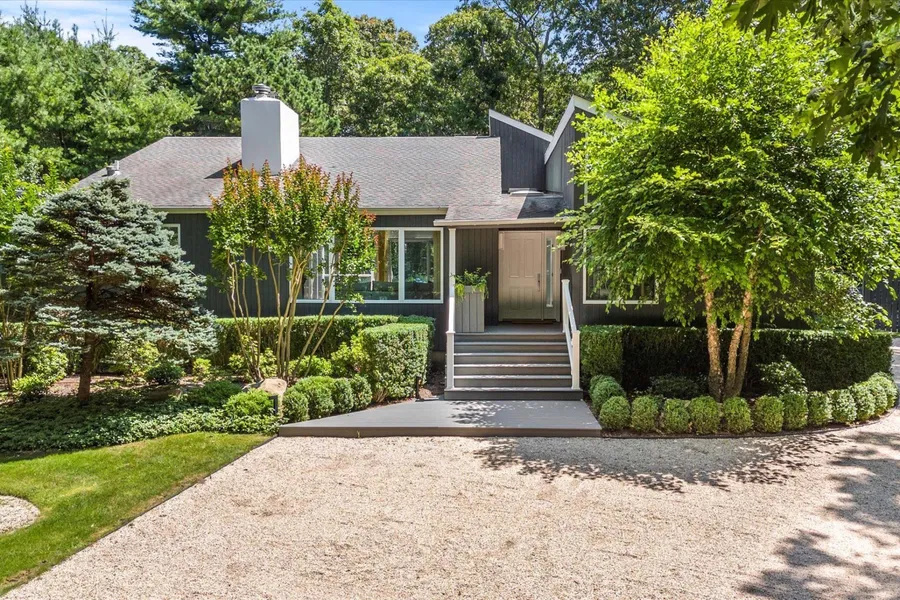 This stunning contemporary home redefines modern living with its clean lines, dramatic vaulted ceilings, and walls of glass that flood the interior with natural light. Fully renovated in 2016, the open-concept living area seamlessly blends indoor and outdoor spaces, creating an entertainer's paradise. Imagine hosting gatherings on the expansive deck overlooking the heated pool and spa, or enjoying more intimate moments in the screened porch. This home offers the ease of one-level living, featuring a spacious living and dining room with a striking central fireplace and soaring vaulted ceilings. The open-plan kitchen, designed for both style and functionality, features high-end appliances and effortlessly connects to the dining and living areas, making entertaining a breeze. Retreat to your private primary bedroom wing, complete with a dedicated office area and a luxurious en-suite bathroom. Three additional bedrooms, each situated in their own wing, provide ample space and privacy for loved ones and guests. The finished lower level expands the living space with a large media room, a gym, and generous storage space. Tranquility abounds on the beautifully landscaped grounds, visible from every room in the house. Located minutes to East Hampton Village and to world-class bay beaches, this exceptional home embodies the coveted Hamptons lifestyle, offering a perfect blend of sophistication, comfort, and effortless elegance in a totally private setting.