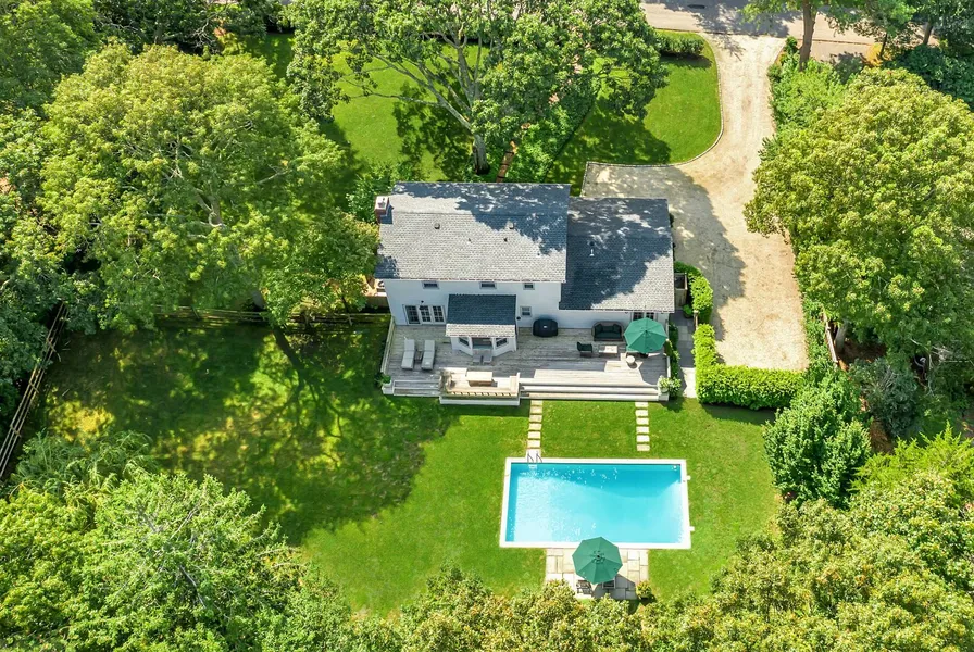 This lovely 4 bedroom 3 1/2 bathroom traditional is a move in ready home. Set behind private hedges on a generous .6 acre property, sits this home renovated in 2014. A warm and inviting entry foyer leads into the light filled living room that spans from the front of the house to the rear. A fireplace takes center stage. The double French doors lead out to the spacious, private, nicely landscaped yard. The living area transitions easily into the kitchen with a large island overlooking the expansive decking, private back yard and swimming pool. The formal dining room also connects directly into the kitchen, creating a perfect flow for entertaining. The first floor houses one of the two primary suites in this home. There is also a Powder room and the laundry area right off the attached one car garage. The second floor offers the second primary suite with 2 walk in closets. There are two additional spacious guest rooms and a hall bath. The home has a full basement, gas burner, separate hot water heater and a new IASS Innovative & Alternative Septic System installed in 2022. The outdoor amenities include a large deck with several entertaining spaces or spaces to relax. There is an inviting swimming pool set into the vast lawn area. The outdoor shower is privately located off the house. Less than .3 of a mile away is a quiet bay beach for lounging or launching your water toys.