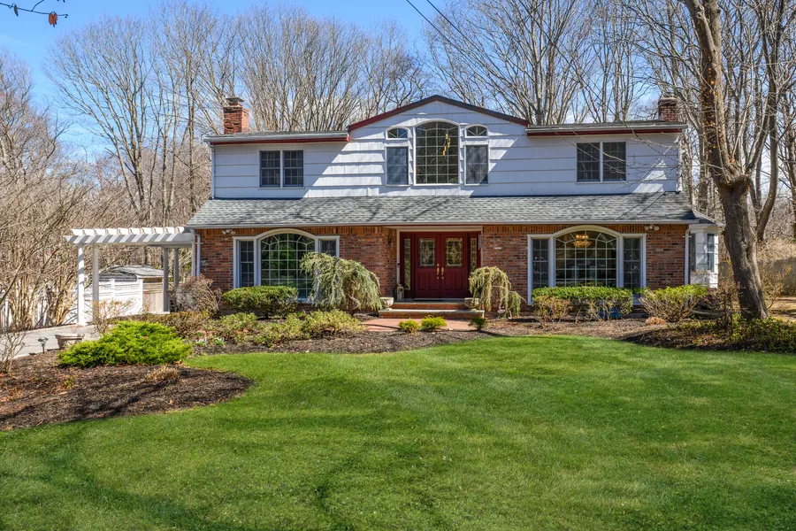 Custom beauty in an incredible spot. Location, serenity and SPACE! Nestled deep on a leafy cul-de-sac north of 25A, this sprawling, 5-bedroom, 3-bath home lives like a spacious colonial. The thoughtfully designed floorplan is perfect for both everyday living and entertaining. A wide, center hall foyer is flanked by an impressive living room with stone fireplace, and a formal dining room. The granite kitchen features an extended breakfast nook and the sunken family room offers sliders to the rear patio, yard and breathtaking wooded view! Work from home in the dedicated home office then take a break in the enclosed porch, where you'll enjoy gorgeous natural vistas in every season. Upstairs, find 5 BIG bedrooms offering fantastic closet space, wood floors beneath the carpet and vaulted ceilings. An entire wall of closets are found in the stately primary bedroom, featuring a full ensuite bath. Floor to ceiling windows flood this home with sunlight. Outside, a large portion of the 1 acre property offers room for a pool, play or simple enjoyment. Beyond the lawn, the lot dips into stunning, wooded, natural seclusion. Updated roof, central air, hot water heater and gas burner. In ground sprinkler system, wood beneath the carpets. A rare opportunity to own on this tree-lined, very private cul-de-sac. Just minutes from beautiful Northport Village, Crab Meadow beach, trails, golf and the Winery, the location could not be better. Hurry!