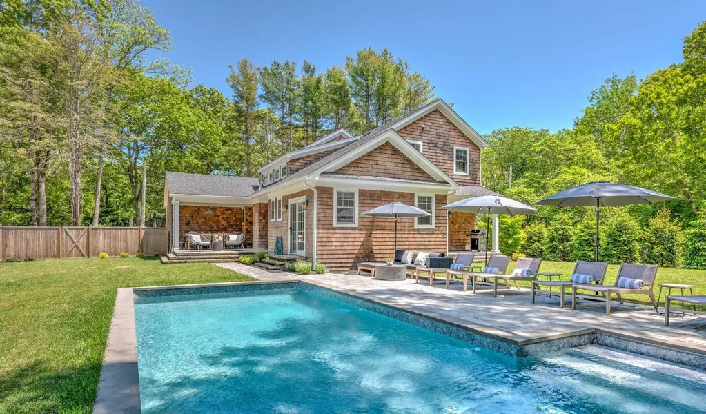 This impeccably maintained traditional home, built in 2018, features 6 bedrooms and 4.5 baths. The first floor boasts light-filled living areas, including a double-height living room with a marble fireplace, French doors leading to a rear terrace, and an eat-in kitchen with island seating and stainless steel appliances. A formal dining room and a den-sitting room, which can be closed off with pocket doors, are also located on the first floor. The bedrooms, one on the first floor and three upstairs are spacious and bright. The first floor primary suite includes a luxurious bath with a double vanity and a frameless glass-enclosed shower. The finished lower level offers 2 bedrooms, a media room, a bar, a full bath, a gym, and an infrared sauna. Outside, you can entertain or dine al fresco on the covered stone porch, or enjoy the heated pool. This home is conveniently located half a mile from Amagansett restaurants and shops and just 5 minutes from East Hampton Village.