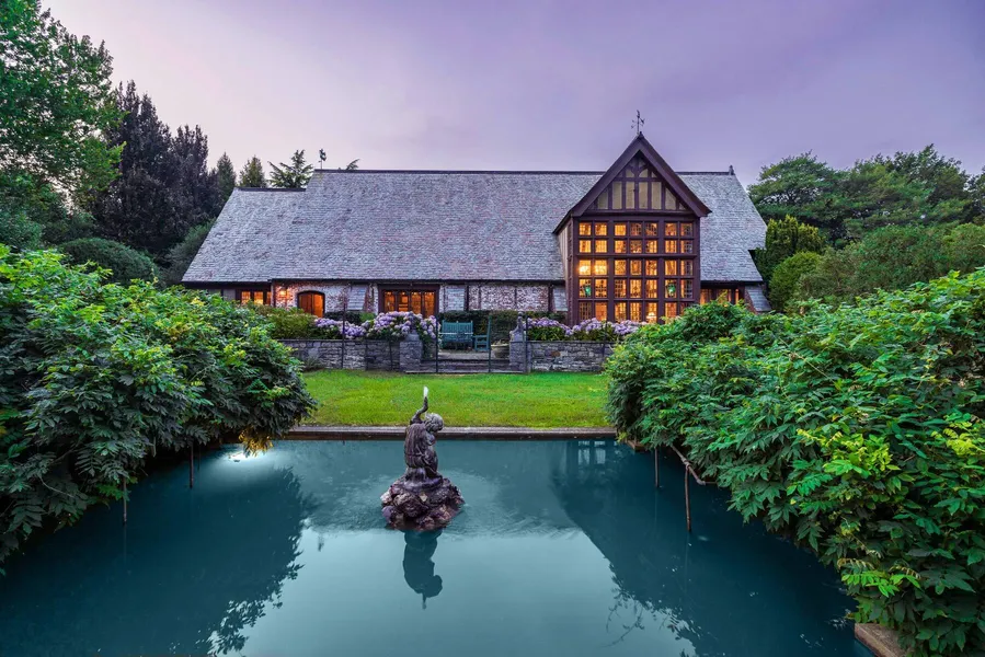 This milestone in Hamptons architecture was designed by the legendary Francis Burrall Hoffman Jr. and constructed for Marjorie Woodhouse by her parents, Lorenzo and Mary Woodhouse, who were largely responsible for underwriting the East Hampton Library (1912), the restoration of Clinton Academy (1921), and establishing Guild Hall (1931). A magnificent 75-foot-long Elizabethan-styled salon with a 40-foot vaulted ceiling is the centerpiece of the residence. In its early years, the salon had a stage used for performances which gave rise to the naming of the home as the "Playhouse." Off the salon are 5 bedrooms, 5 baths, and a renovated kitchen. A beautiful copper-clad, glass conservatory with bluestone flooring has recently been added off the kitchen. The conservatory links the back terrace and grounds with the entire ground floor -- gracefully expanding the flexibility and flow of the living/entertaining, indoor/outdoor areas of the home. The grounds feature a heated gunite pool, a fountain, and nearly 3+/- acres of exquisitely designed mature landscaping and overwhelmingly beautiful specimen trees. In 2020, the Playhouse won a prestigious AIA design award for the glassed conservatory addition. Not since 1958 has this historic landmark been available for sale, which is considered by many to be one of the most significant structures in East Hampton's fabled history. Acres of reserve land are on the Southern border with Nature Trails and the Wildlife Sanctuary. Huntting Lane intersects with Main Street, meaning that village shops, museums, and restaurants are just a stroll away. On the other end is Egypt Lane that takes you to Maidstone, one of the oldest links golf courses in the world, and Atlantic Beach, one of the top 10 in the country.