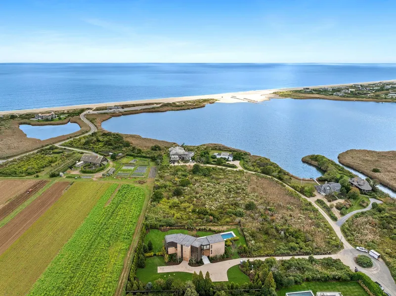 In the heart of coveted Sagaponack South, just a 1/2 mile to the ocean, this location is a one of a kind. The views from this property covers it all, the ocean, Sagg Pond, and protected farmland. The property abuts 20 acres of farmland to the East and looks out over 90 +/- acres of protected reserve for an expansive feel. This home is masterfully crafted for the discerning Hamptons buyer, the 5,400 +/- sq. ft., 5-bedroom, 4.5-bath home - with 2,500 +/- sq. ft. of outdoor living space - is nothing short of spectacular. Enter your new home through a three-story foyer, outfitted with beautiful slab stone, large-scale window walls, and a dramatic floating staircase; or through your private glass elevator, taking you wherever you want to go. The first floor is a stunning open concept. The oversized chef's kitchen includes Wolf and Sub-Zero appliances, Bakes & Kropp cabinetry, a creatively des...