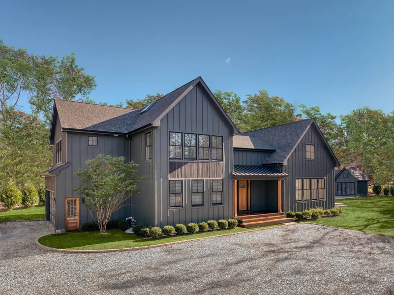 Introducing this just completed modern barn-style residence set on a beautiful, private shy-acre parcel at the end of a quiet cul-de-sac in East Hampton. Spanning approximately 5,900 square feet across three light-filled levels, this exceptional home blends sophisticated design with relaxed Hamptons living. Upon entry, a generous foyer with a custom shiplapped bar area complete with ice maker and beverage refrigerator sets the tone for the home's refined yet welcoming aesthetic. The expansive great room features soaring ceilings with exposed wood beams and an open floor plan anchored by a striking wood-burning fireplace with bluestone and shiplap surround. Adjacent is an oversized dining area, ideal for effortless indoor-outdoor entertaining with double French doors leading to the spacious patio and pool. The designer kitchen offers custom cabinetry, an oversized island, quartz counterto...