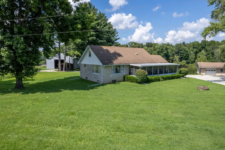 Welcome to your dream fishing retreat! Nestled on 18.15 acres, this unique private lake property offers a perfect blend of comfort, privacy and natural beauty. The charming story and a half Bedford stone home includes 3 bedrooms, 2 full baths, full basement and a wonderful screened in front porch for those relaxing mornings and evenings. There's a large Living room and a Family room that could also be partially turned into a dining area with the original working fireplace.